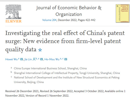 Wu, Howei, Jia Lin, and Ho-Mou Wu. "Investigating the real effect of China’s patent surge: New evidence from firm-level patent quality data." Journal of Economic Behavior & Organization 204 (2022): 422-442.