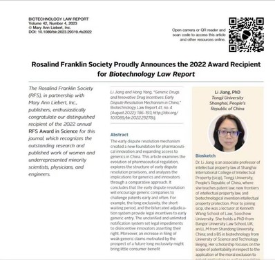 The Biotechnology Law Report published in its Issue 41 of August 2022 the professional article titled "Incentive Mechanisms for Generic and Innovative Drugs: China's Early Resolution Mechanism for Pharmaceutical Patent Disputes", co-authored by Associate Professors Jiang Li and Yang Hong of Shanghai International College of Intellectual Property. This article was honored with the 2022 Rosalind Franklin Society Award in Science.