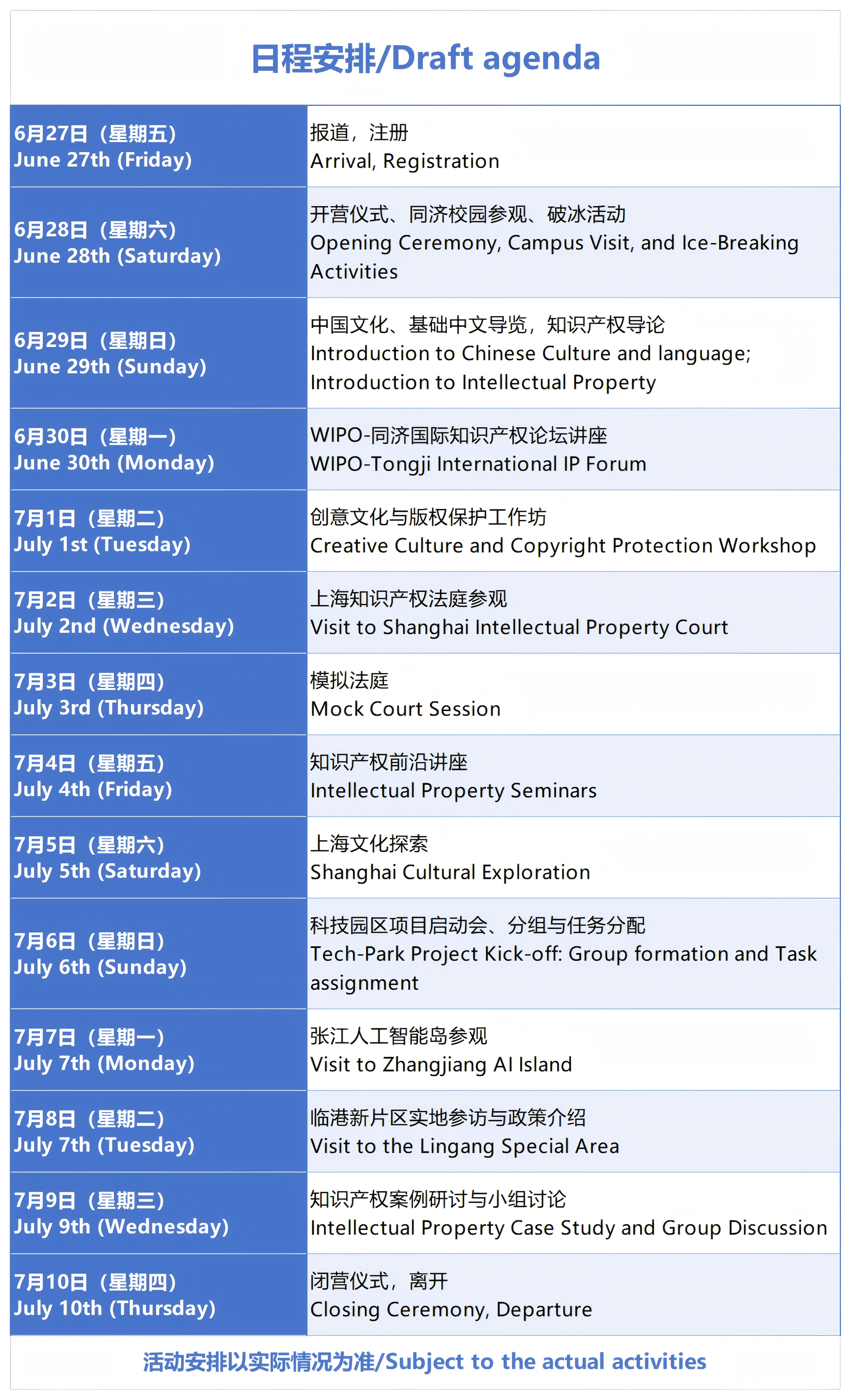 Amid the rapid wave of technological advancement, intellectual property (IP) has become increasingly recognized worldwide as a driving force for innovation. To promote international exchange in the field of intellectual property, the Shanghai International College of Intellectual Property (SICIP) at Tongji University will host the inaugural Shanghai International Summer Camp on Intellectual Property from June 27 to July 10, 2025. We welcome outstanding undergraduate and graduate students from around the world to gather in Shanghai for an exploration journey that integrates academic exchange, practical experience, and field trips.