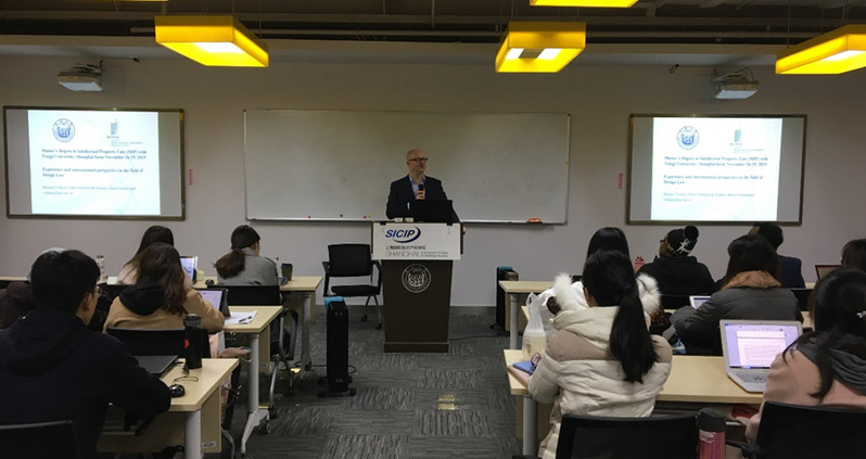2019年11月26日至29日,世界知识产权组织(WIPO)特邀专家Bernard Volken 律师(瑞士)来我院为WIPO-同济知识产权法硕士项目学生讲授设计法课程,系统介绍了欧盟工业品外观设计保护规则和依据《工业品外观设计国际注册海牙协定》建立的国际注册体系。Volken律师采用灵活的课堂教学方式,让学生分组讨论如何将选定的工业产品通过海牙体系进行国际申请注册并完成方案陈述。