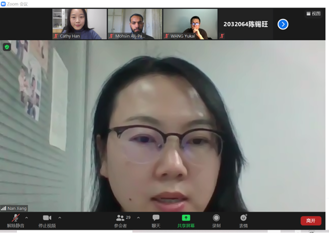 副院长姜南副教授作结束致辞,她指出本次沙龙是不错的尝试,今后将邀请更多师生和校友参与交流。感谢参与者对学院建设提出的意见和建议,学院将不断完善国际学生联络体系网络和联络机制。今后,学院会开展多种形式的学术和文化活动,希望大家积极参与。祝新年快乐!